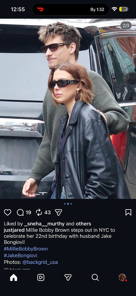 Millie Bobby Brown (I think she changed her name, but she will always be MBB to me). Did y’all clock that she didn’t go to Maya Hawke’s wedding? I did. I also walked past Maya and her now-husband on the street a couple of days before their wedding. No shade, I fully thought she was a lesbian.
