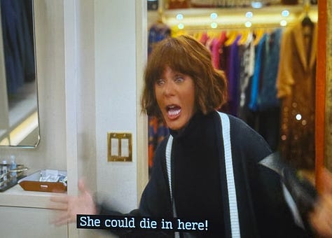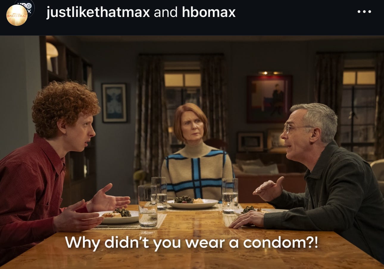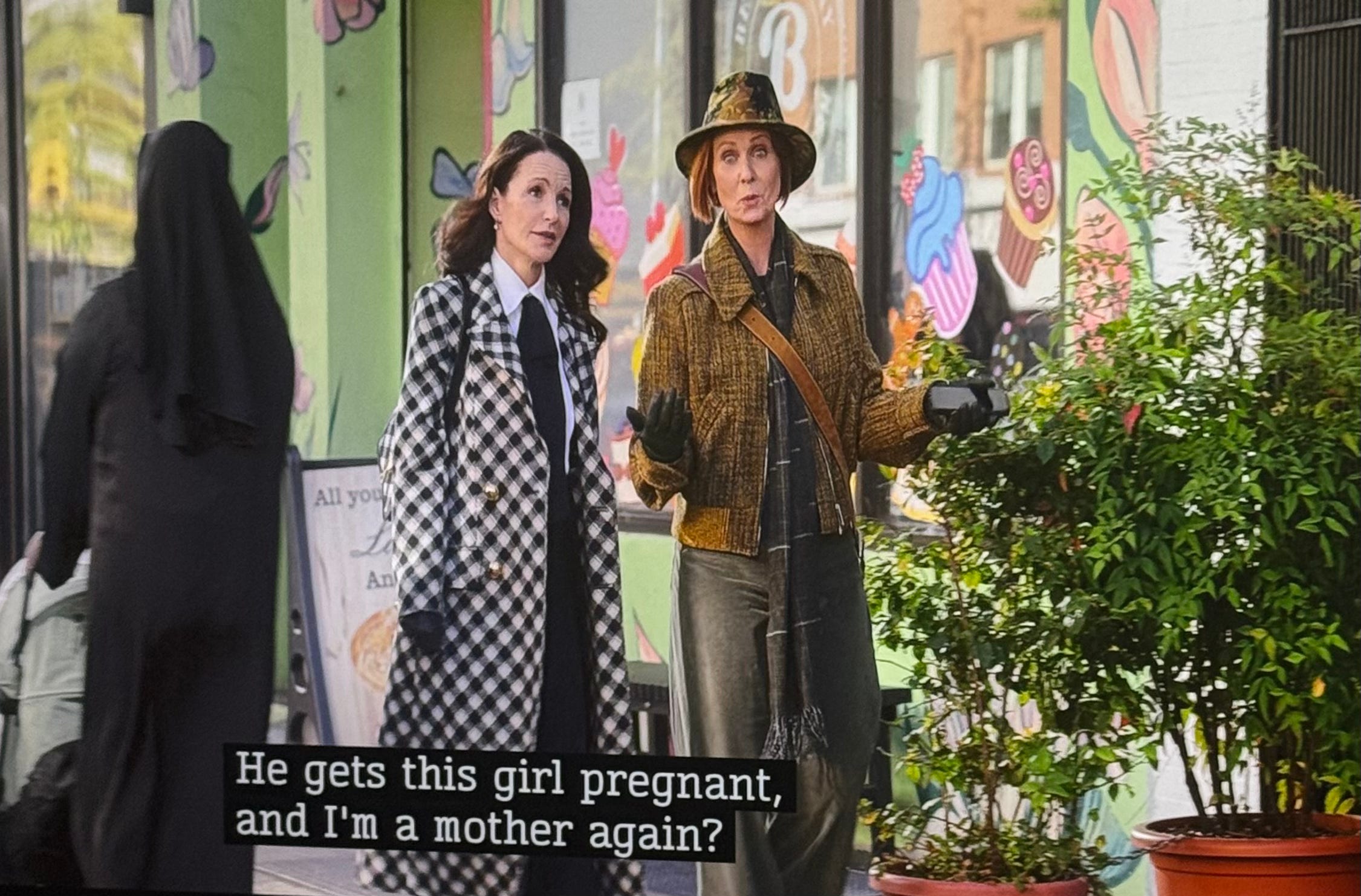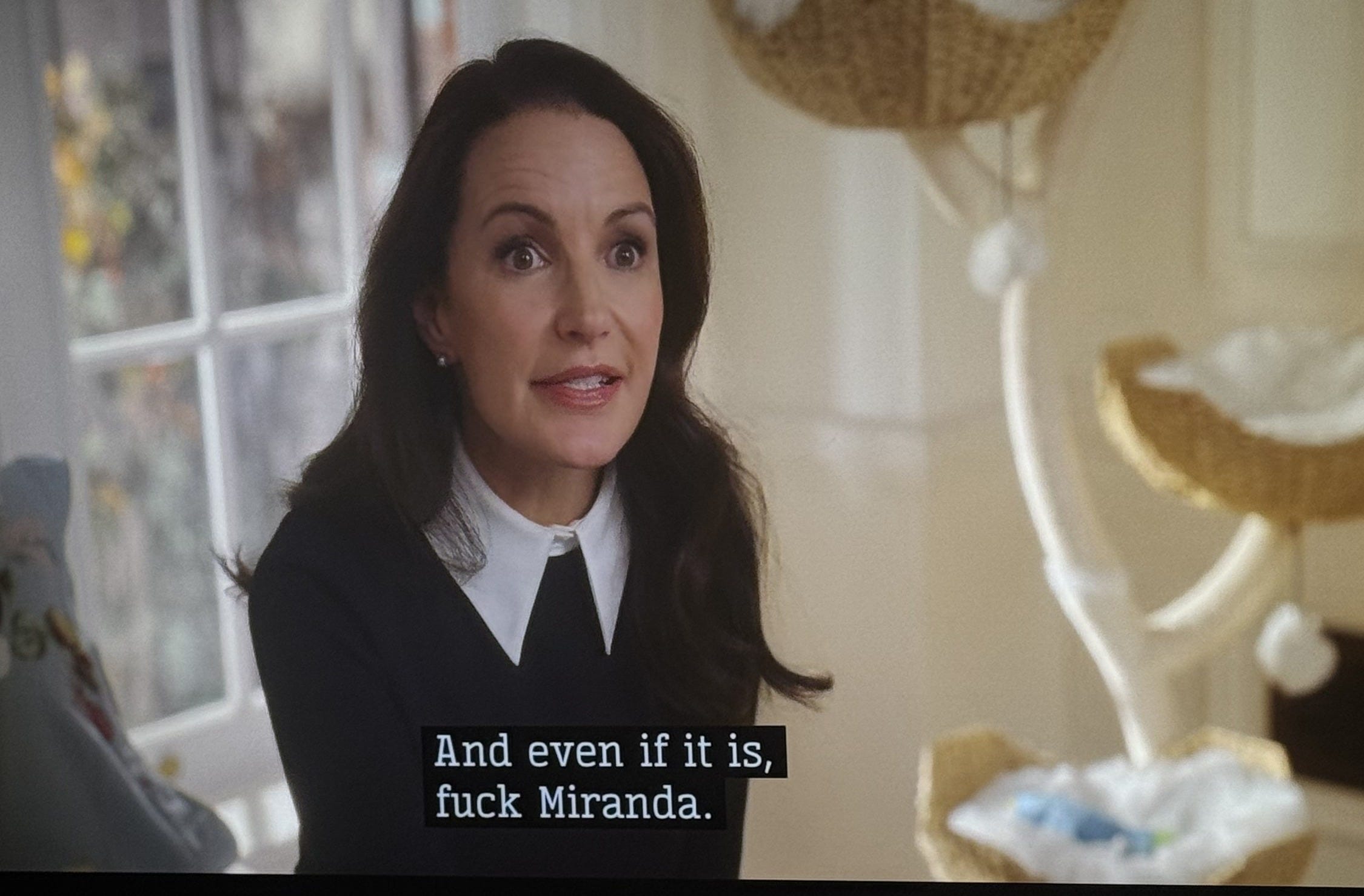 Miranda lies and says that Mia’s services are highly recommended. The receptionist is confused because they don’t have a stylist named Mia. Mia overhears and is very pregnant. The receptionist reveals that she is actually “the shampoo girl” and is confused why her services are recommended, but ultimately takes the compliment as an excuse to talk about her pending wellness app……I can see Miranda’s gears turning. Miranda tries to ask about the baby, and then goes too far when she asks how she knows who the dad is. Miranda, what the fuck was that? You can’t just ask a stranger that! No matter if she is carrying your grandchild. All she had to do was be normal and ask normal questions, Jesus.