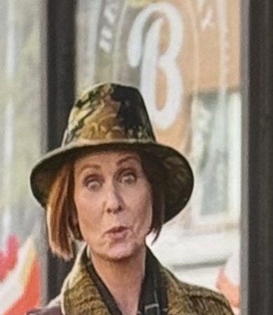 Miranda is venting to Charlotte about Brady’s baby mama, and they both look like lesbian detectives from the 70s. What the hell do they have on? Let’s start with Charlotte. The coat is very cute, and I believe Charlotte would wear it. However, the entire outfit put together makes her look so formal. Too formal to just be walking down the street gossiping with your girlfriend. She also just looks like a lesbian here. I can’t explain it; she just does. Maybe it’s her proximity to Miranda. Which brings me to the hat.