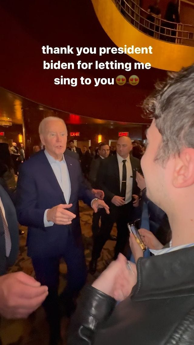 I fully believed that it started organically but now he is somehow in touch with these people’s teams and organizes time for him to show up and sing to them. After reading the Rolling Stone profile, that confirmed that I was right. Brands are hiring him now to rack up views and engagement at events. They don’t tell the celebrities so their reactions are genuine. If I was Dua Lipa, or apparently Joe Biden, I would be terrified that he was lurking around every corner.